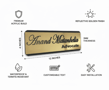 Enhance your office environment with our Customized Black Matte Acrylic Office Name Plates featuring elegant golden acrylic solid letters. This bespoke nameplate combines modern aesthetics with personalized charm, making it a perfect addition to any professional setting.